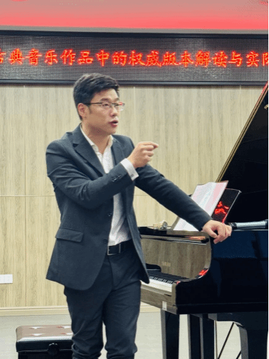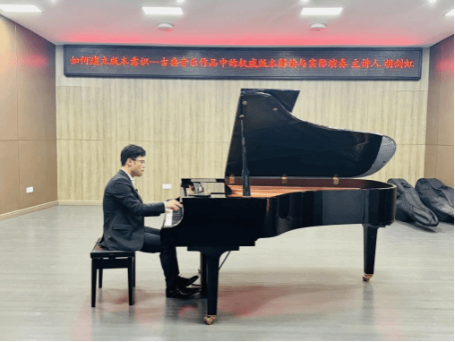 培养“版本意识”,诠释“音乐表演”。胡剑虹从古典音乐作品版本选择的重要性切入,通过经典曲目的分析以及现场演奏,为学生展示了权威版本在音乐诠释中的核心地位。他强调,不同版本背后蕴含的历史背景、编辑理念和风格特征,直接影响音乐表演的艺术表现。