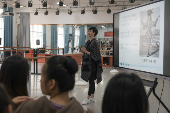 在随后的大师课上,胡老师亲自示范指导,对学生们的基本功、舞蹈技巧和艺术表现力进行了细致入微的指导。她耐心细致的讲解和精准到位的示范,让学生们受益匪浅。课堂上,学生们认真聆听,积极互动,展现出琼台师范学院学子良好的精神风貌和扎实的专业素养。